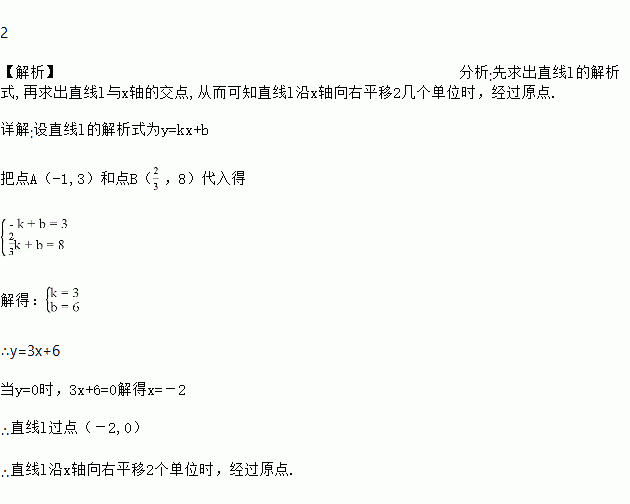 在平面直角坐标系中,直线l经过点A(-1,3)和点B(,8),请问将直线l沿x轴向右平移几个单位时,正好经过原点?
