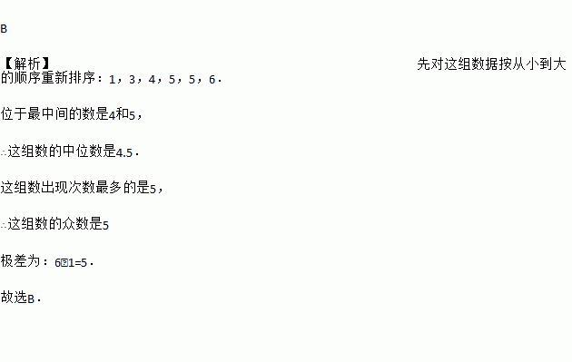 B 【解析】先对这组数据按从小到大的顺序重新排序:1,3,4,5,5,6. 位于最中间的数是4和5, ∴这组数的中位数是4.5. 这组数出现次数最多的是5, ∴这组数的众数是5 极差为:6﹣1=5. 故选B.