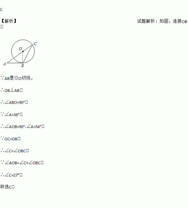 如图,AB与⊙O相切于点B,AO的延长线交⊙O于点C,连结BC.若∠A=36°,则∠C=( )