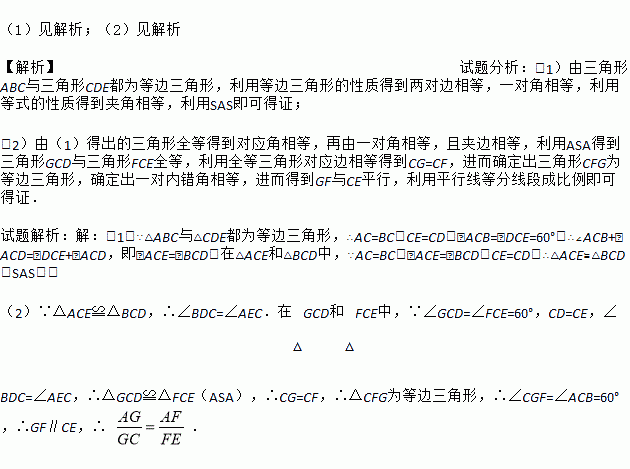 如图,已知B,C,E三点在同一条直线上,△ABC与△DCE都是等边三角形,其中线段BD交AC于点G,线段AE交CD于点F.求证:(1)△ACE≌△BCD;(2).