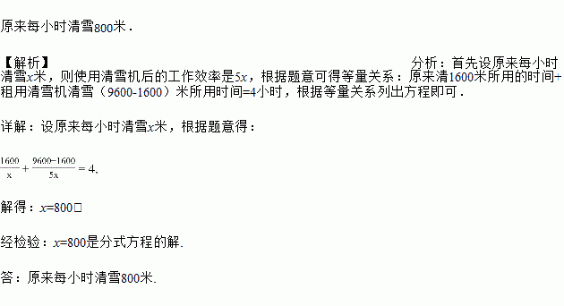 某环卫清洁队承担着9600米长的街道清雪任务,在清雪1600米后,为了减少对交通的影响,决定租用清雪机清雪,结果共用了4小时就完成了清雪任务.已知使用清雪机后的工作效率是原来的5倍,求原来每小时清雪多少米?