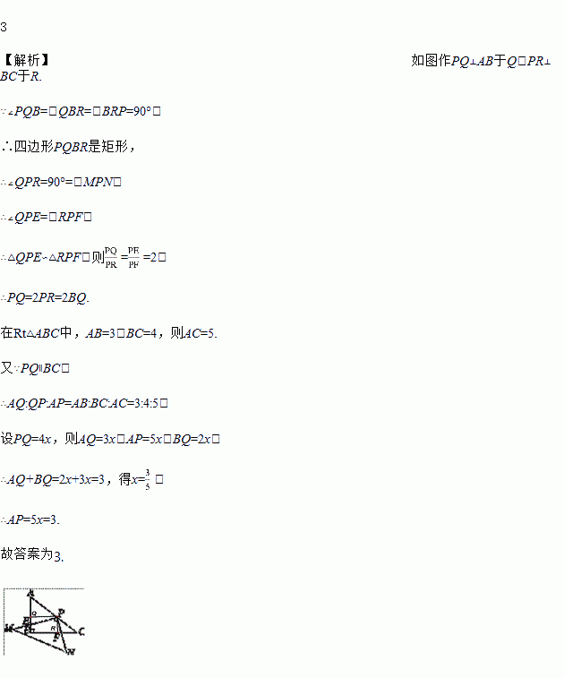 如图,在Rt△ABC中,∠ABC=90°,AB=3,BC=4.Rt△MPN中,∠MPN=90°,点P在AC上,PM交AB于点E,PN交BC于点F,当PE=2PF时,AP=________.