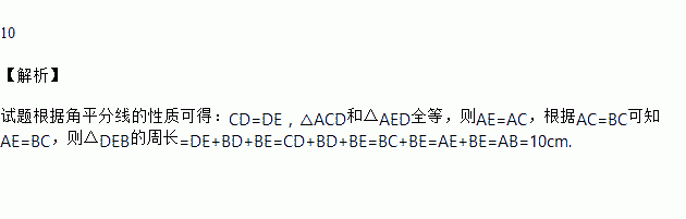 如图,△ABC 中,∠C=90°,AC=BC, AD 平分∠BAC 交 BC 于点 D,DE⊥AB,垂足为 E,且 AB=10cm,则△DEB 的周长是_____cm.