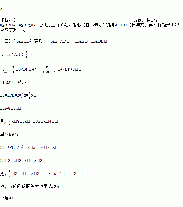 ,点P从点B出发,沿着菱形的对角线出发运动到点D,过点P作BD的垂线,分别与AB、BC或AD、CD交于点E、F,过点E、F作BD的平行线,构造矩形EFGH,设矩形EFGH的面积为y,点P运动的路程为x,则y与x的函数图象大致是( )