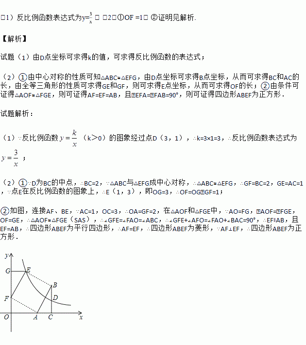 (2)若△ABC与△EFG成中心对称,且△EFG的边FG在y轴的正半轴上,点E在这个函数的图象上.