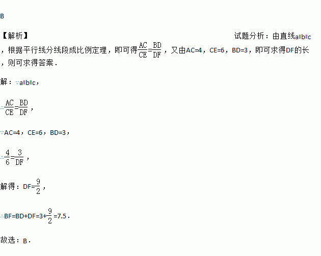 如图,已知直线a∥b∥c,直线m、n与直线a、b、c分别交于点A、C、E、B、D、F,AC=4,CE=6,BD=3,则BF=( )