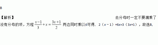 B 【解析】去分母时一定不要漏乘了没有分母的项,方程两边同时乘以6可得. 2(x﹣1)+6x=3(3x+1),故选B.