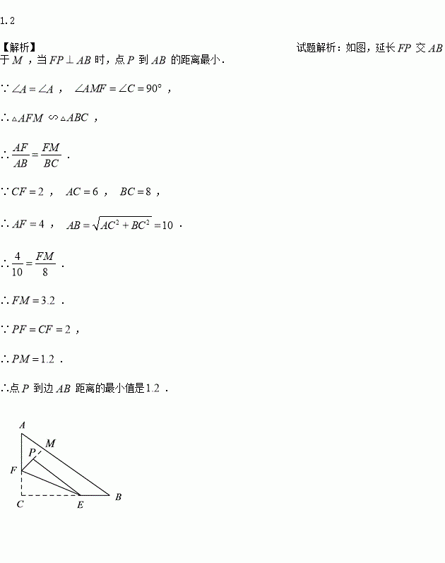 如图,在中, , , ,点在边上,并且,点为边边上动点,将沿直线翻折,点落在点处,则点到边距离的最小值的值是__________.