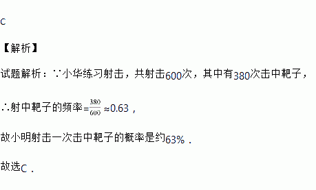 小华练习射击,共射击600次,其中380次击中靶子,由此估计,小华射击一次击中靶子的概率是( )