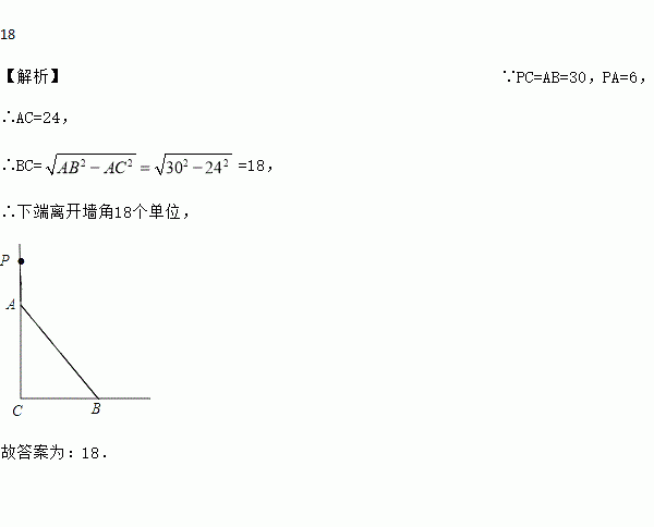 18 【解析】∵PC=AB=30,PA=6, ∴AC=24, ∴BC==18, ∴下端离开墙角18个单位, 故答案为:18.