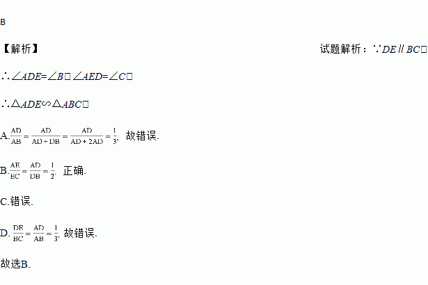 如图,在△ABC中,点D,E分别在边AB,AC上,DE∥BC,若BD=2AD,则( )
