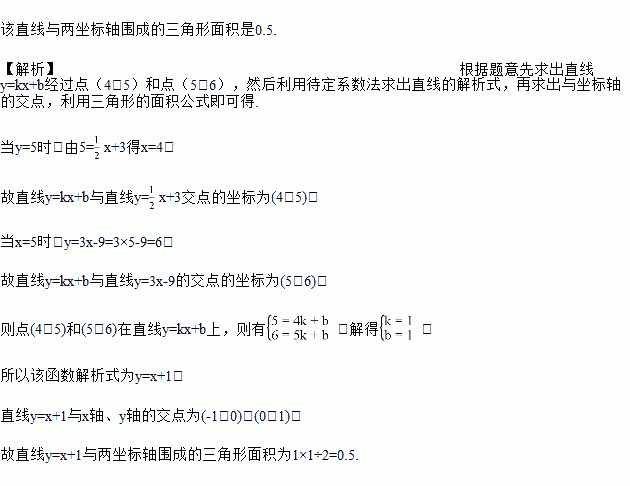 有一条直线y=kx+b,它与直线y=x+3交点的纵坐标为5,而与直线y=3x-9的交点的横坐标也是5.求该直线与两坐标轴围成的三角形面积.
