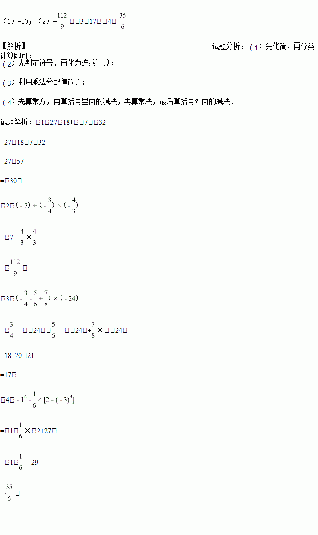 (1)27﹣18+(﹣7)﹣32; (2) ;