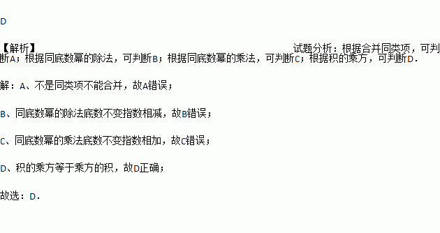 A. a2+b3=2a5 B. a4÷a=a4 C. a2•a3=a6 D. (-a2)3=﹣a6