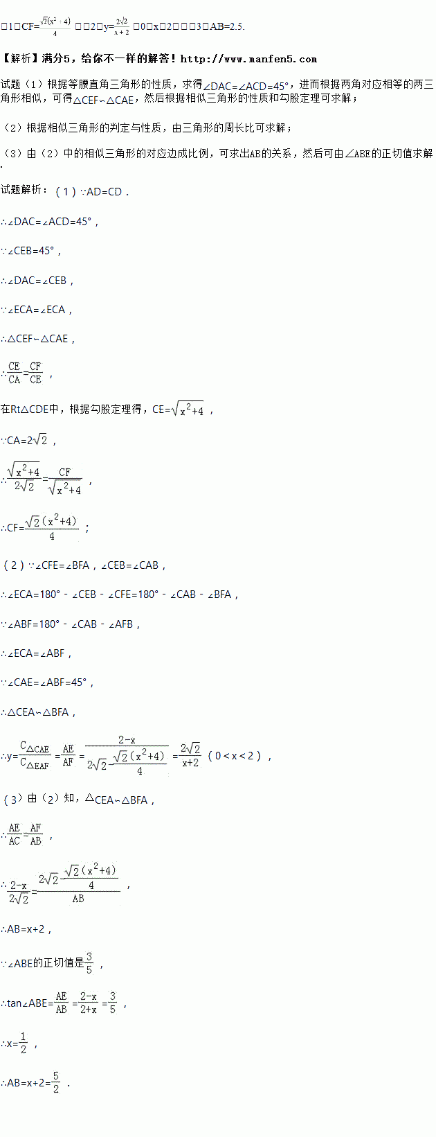 已知:如图,在梯形ABCD中,AB∥CD,∠D=90°,AD=CD=2,点E在边AD上(不与点A、D重合),∠CEB=45°,EB与对角线AC相交于点F,设DE=x.