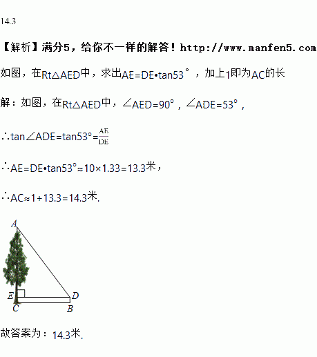 如图,为地面上一点,测得点到树底部的距离为米,在点处放置一个米高的测角仪,并测得树顶的仰角为,则树高约为________ 米(精确到米).