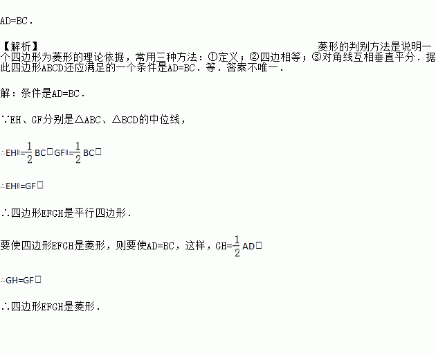 如图,在四边形ABCD中,E、F、G、H分别是AB、BD、CD、AC的中点,要使四边形EFGH是菱形,四边形ABCD还应满足的一个条件是______.