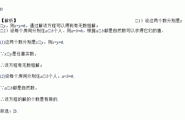 给出两个问题(1)两数之和为6,求这两个数?(2)两个房间共住6人,每个房间各住几人?这两个问题的解的情况是( )