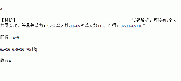 A ¡¾½âÎö¡¿ÊÔÌâ½âÎö£º¿ÉÉèÓÐx¸öÈ˹²Í¬Âò¼¦£¬µÈÁ¿¹ØÏµÎª£º9¡ÁÂò¼¦ÈËÊý-11=6¡ÁÂò¼¦ÈËÊý+16£¬¿ÉµÃ£º9x-11=6x+16£¬ ½âµÃ£ºx=9 6x+16=6¡Á9+16=70(Ç®). ¹ÊÑ¡A