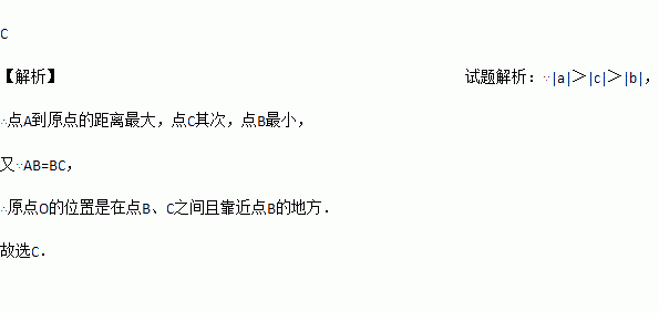 如图,数轴上的A、B、C三点所表示的数分别为a、b、c,AB=BC,如果,那么该数轴的原点O的位置应该在