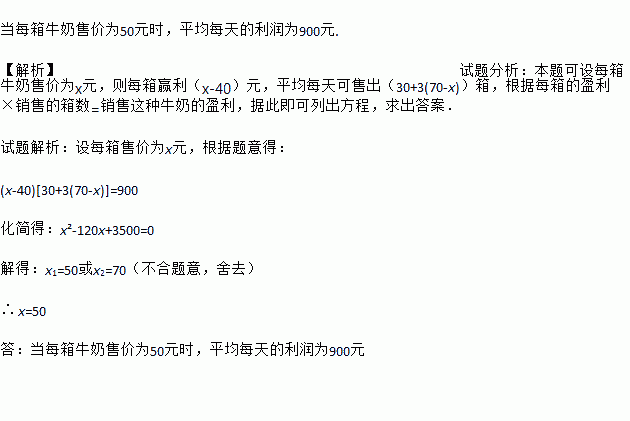 当每箱牛奶售价为50元时,平均每天的利润为900元. 【解析】试题分析:本题可设每箱牛奶售价为x元,则每箱赢利(x-40)元,平均每天可售出(30+3(70-x))箱,根据每箱的盈利×销售的箱数=销售这种牛奶的盈利,据此即可列出方程,求出答案. 试题解析:设每箱售价为x元,根据题意得: (x-40)[30+3(70-x)]=900 化简得:x²-120x+3500=0 ...