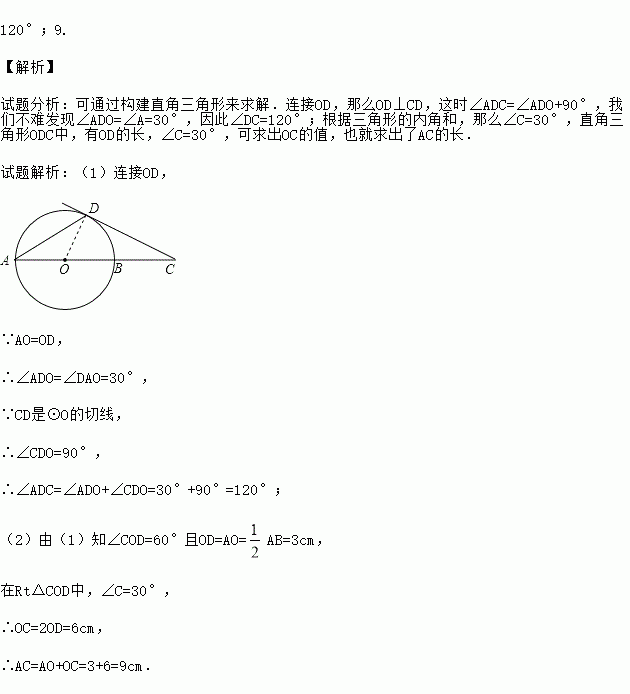 如图,⊙O的直径AB=6cm,D为⊙O上一点,∠BAD=30°,过点D的切线交AB的延长线于点C.求∠ADC的度数及AC的长.