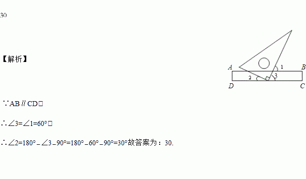 如图,将三角板的直角顶点放在直尺的一边上,若∠1=60°,则∠2的度数为____.