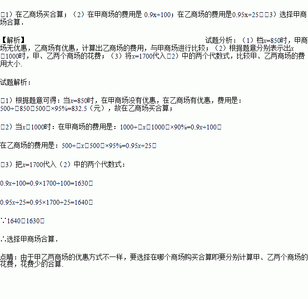 £¨3£©µ±x=1700ʱ£¬¸Ã¹Ë¿ÍӦѡÔñÄÄÒ»¼ÒÉ̳¡¹ºÂò±È½ÏºÏË㣿˵Ã÷ÀíÓÉ£®