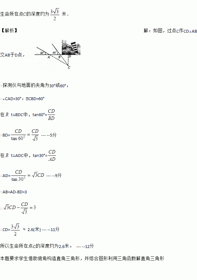 某地震救援队探测出某建筑物废墟下方点C处有生命迹象,已知废墟一侧地面上两探测点A,B相距3米,探测线与地面的夹角分别是30°和60°(如图),试确定生命所在点C的深度.(结果保留根号)