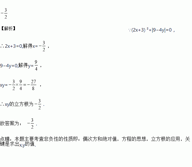 若实数x,y满足(2x+3)2+|9﹣4y|=0,则xy的立方根为______.