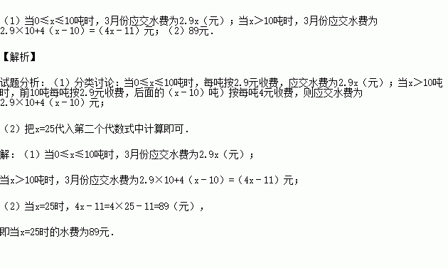 (2015秋•平顶山校级期中)某城市为了鼓励居民节约用水,对自来水用户按如下标准收费:若每月每户用水的最高标准为10吨,超过标准的部分加价收费,不超过10吨,每吨按2.9元收费,超过10吨的部分按每吨4元收费,