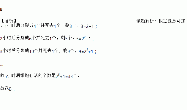 某种细胞开始分裂时有两个,1小时后分裂成4个并死去一个,2小时后分裂成6个并死去一个,3小时后分裂成10个死去一个,按此规律,5小时后细胞存活的个数是( )