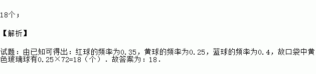 某口袋中有红色、黄色、蓝色玻璃球共72个,小明通过多次摸球试验后,发现摸到红球、黄球、蓝球的频率为35%、25%和40%,估计口袋中黄色玻璃球有 个。