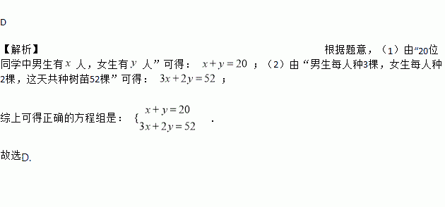 20位同学在植树节这天共种了52棵树苗,其中男生每人种3棵,女生每人种2棵.设男生有x人,女生有y人,根据题意,列方程组正确的是( )