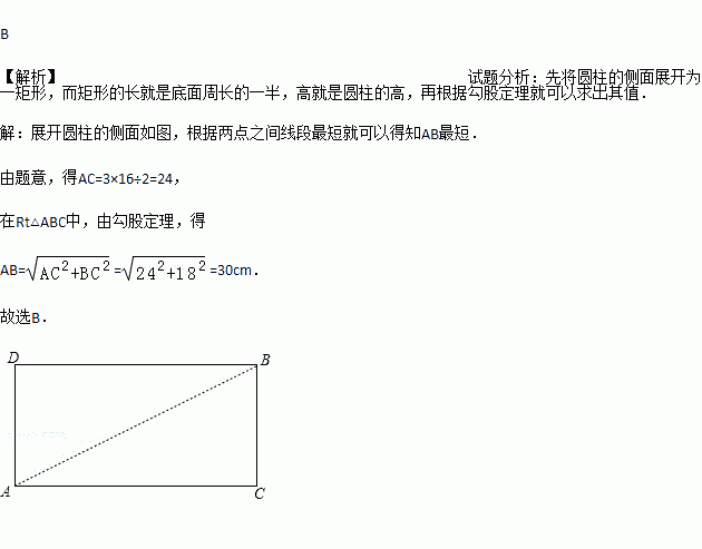 如图,一个圆桶儿,底面直径为16cm,高为18cm,则一只小虫底部点A爬到上底B处,则小虫所爬的最短路径长是(π取3)( )