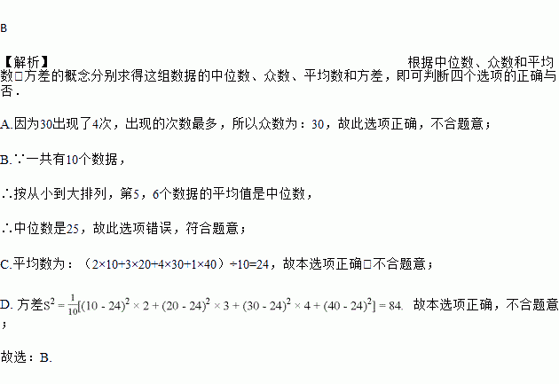 A. 众数为30 B. 中位数为30 C. 平均数为24 D. 方差为84