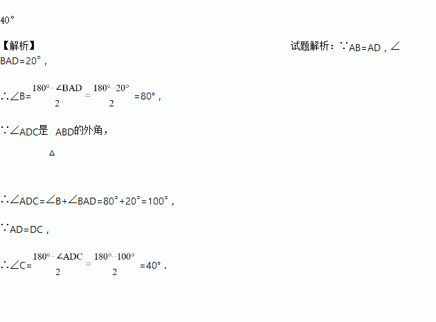 如图,在△ABC中,AB=AD=DC,∠BAD=20°,则∠C=_______.
