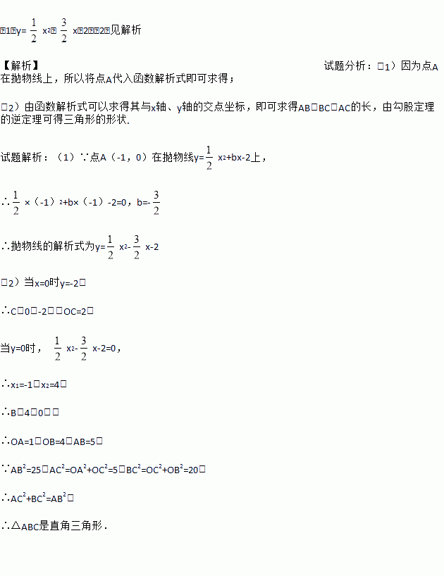 (1)y= x2﹣ x﹣2;(2)见解析 【解析】试题分析:(1)因为点A在抛物线上,所以将点A代入函数解析式即可求得; (2)由函数解析式可以求得其与x轴、y轴的交点坐标,即可求得AB、BC、AC的长,由勾股定理的逆定理可得三角形的形状. 试题解析:(1)∵点A(-1,0)在抛物线y=x2+bx-2上, ∴×(-1)2+b×(-1)-2=0,b=- ∴抛物线的解析式...