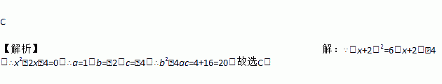 C 【解析】【解析】 ∵(x+2)2=6(x+2)﹣4,∴x2﹣2x﹣4=0,∴a=1,b=﹣2,c=﹣4,∴b2﹣4ac=4+16=20.故选C.