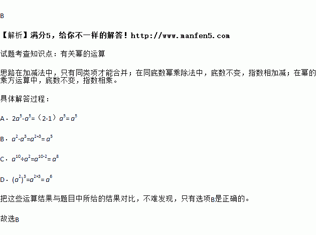A. 2a5-a5=2 B. a2·a3=a5 C. a10÷a2=a5 D. (a2)3=a5