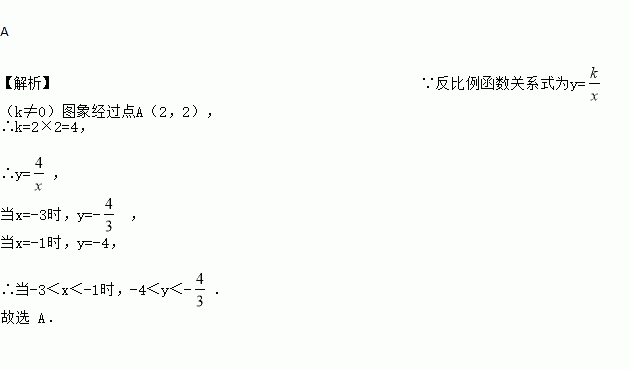 已知反比例函数的图象经过点A(2,2)、B(x,y),当﹣3<x<﹣1时,y的取值范围是( )