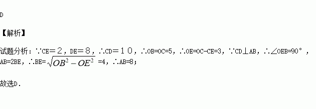 如图,⊙O的直径CD垂直弦AB于点E,且CE=2,DE=8,则AB的长为( )