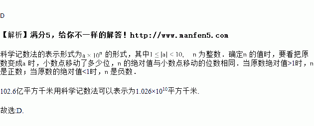 数据102.6亿平方千米用科学记数法表示为 ( )