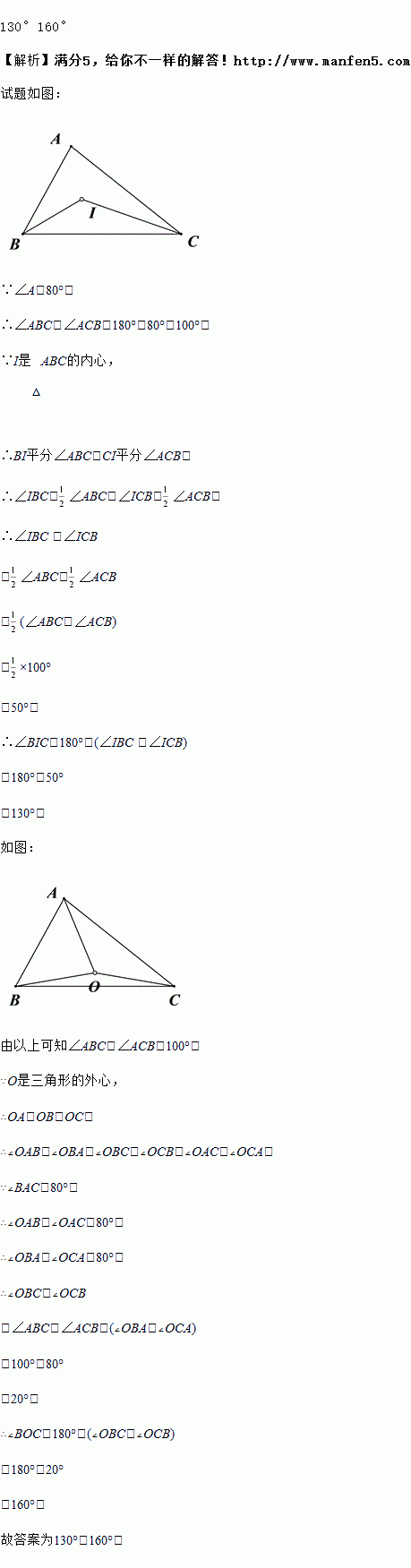 设I是△ABC的内心,O是△ABC的外心,∠A=80°,则∠BIC=________,∠BOC=________.