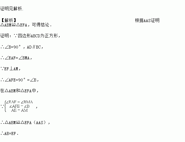 如图,四边形ABCD是正方形,M为BC上一点,连接AM,延长AD至点E,使得AE=AM,过点E作EF⊥AM,垂足为F,求证:AB=EF.