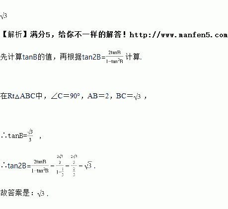 在Rt△ABC中,∠C=90°,AB=2,BC=,则tan 2B=____.
