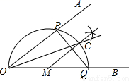 步骤1:在OB上任取一点M,以点M为圆心,MO长为半径画半圆,分别交OA、OB于点P、Q;