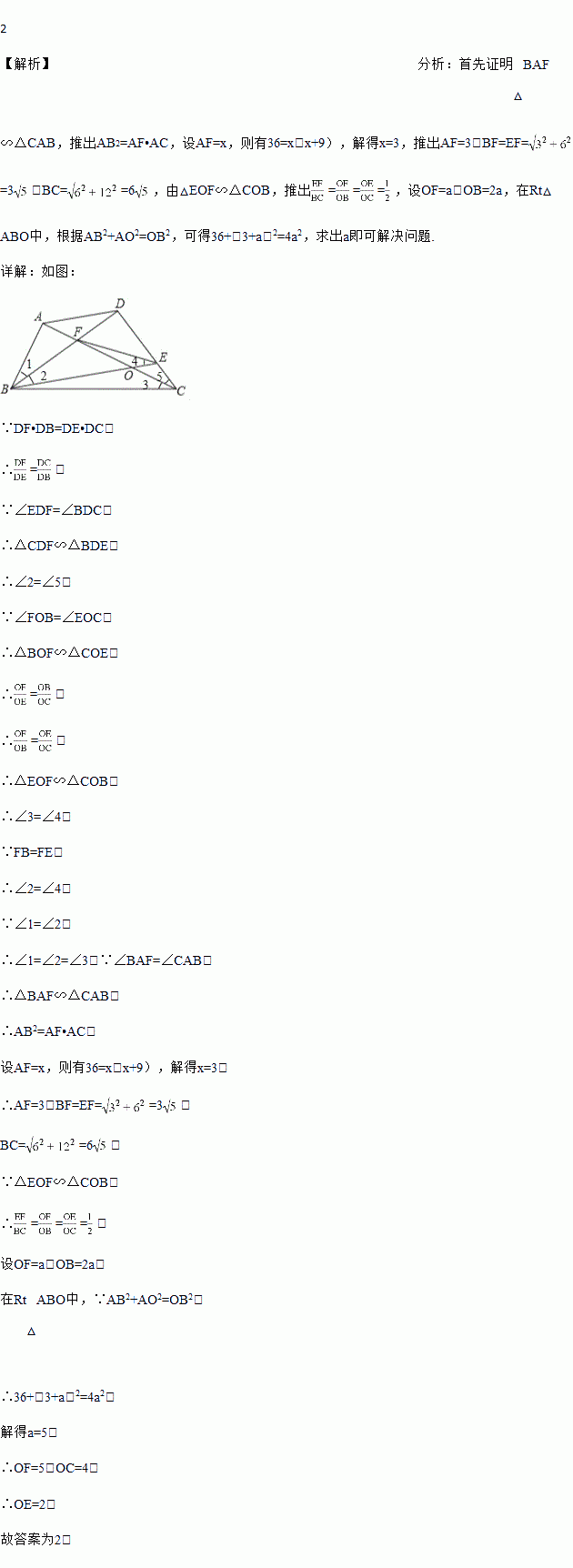 如图,在四边形ABCD中,对角线AC、BD交于点F,AC⊥AB于点A,点E在边CD上,且满足DF•DB=DE•DC,FE=FB,BD平分∠ABE,若AB=6,CF=9,则OE的长为_____.