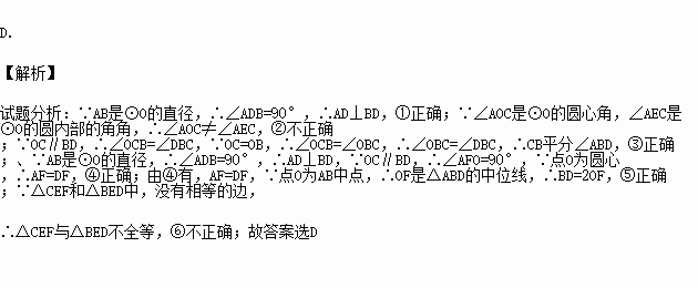 ①AD⊥BD;②∠AOC=∠AEC;③CB平分∠ABD;④AF=DF;⑤BD=2OF;⑥△CEF≌△BED,其中一定成立的是( )