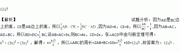 如图,在等腰△ABC中,AB=AC,BC边上的高AD=6cm,腰AB上的高CE=8cm,则△ABC的周长等于_________ cm.